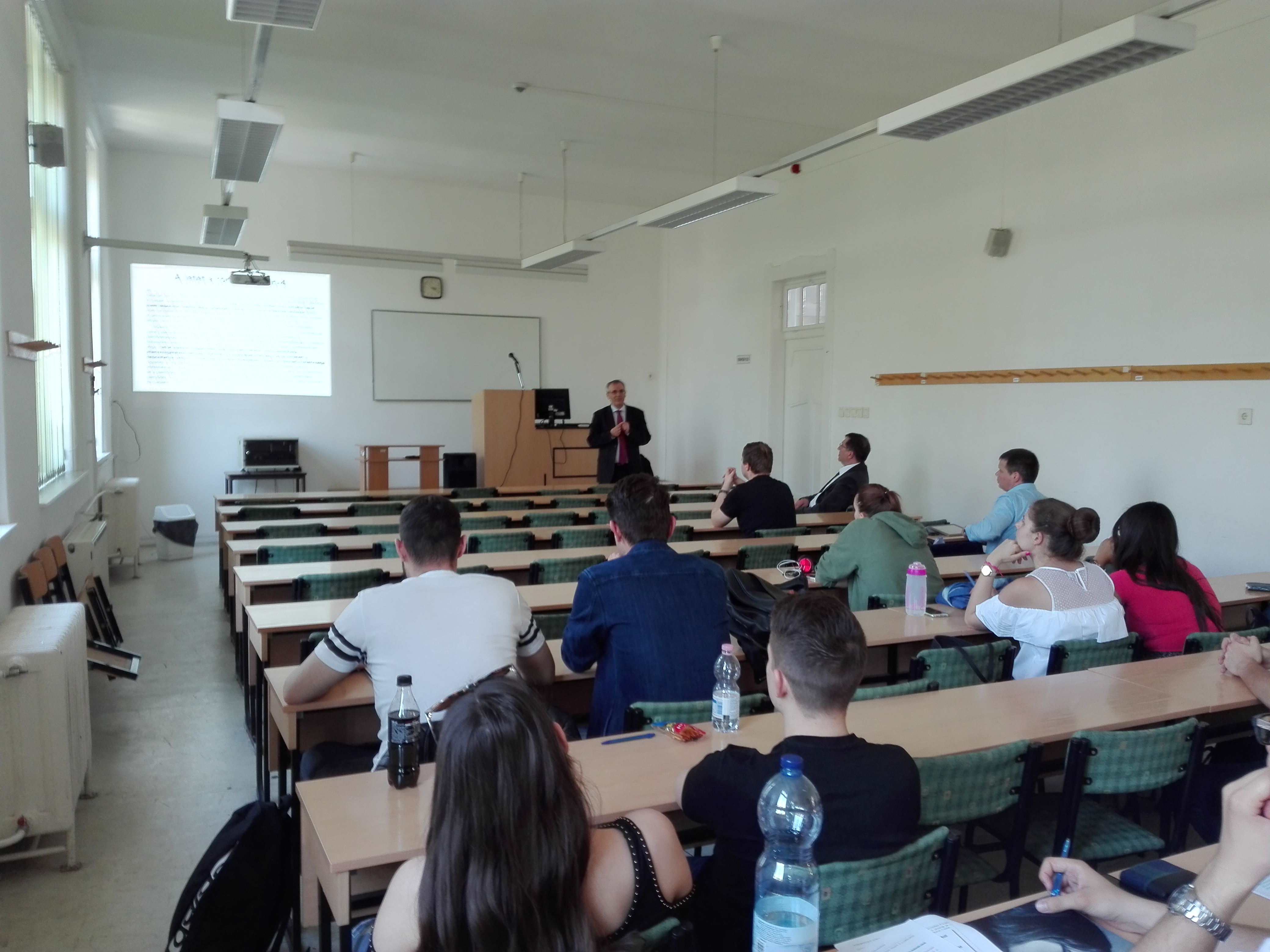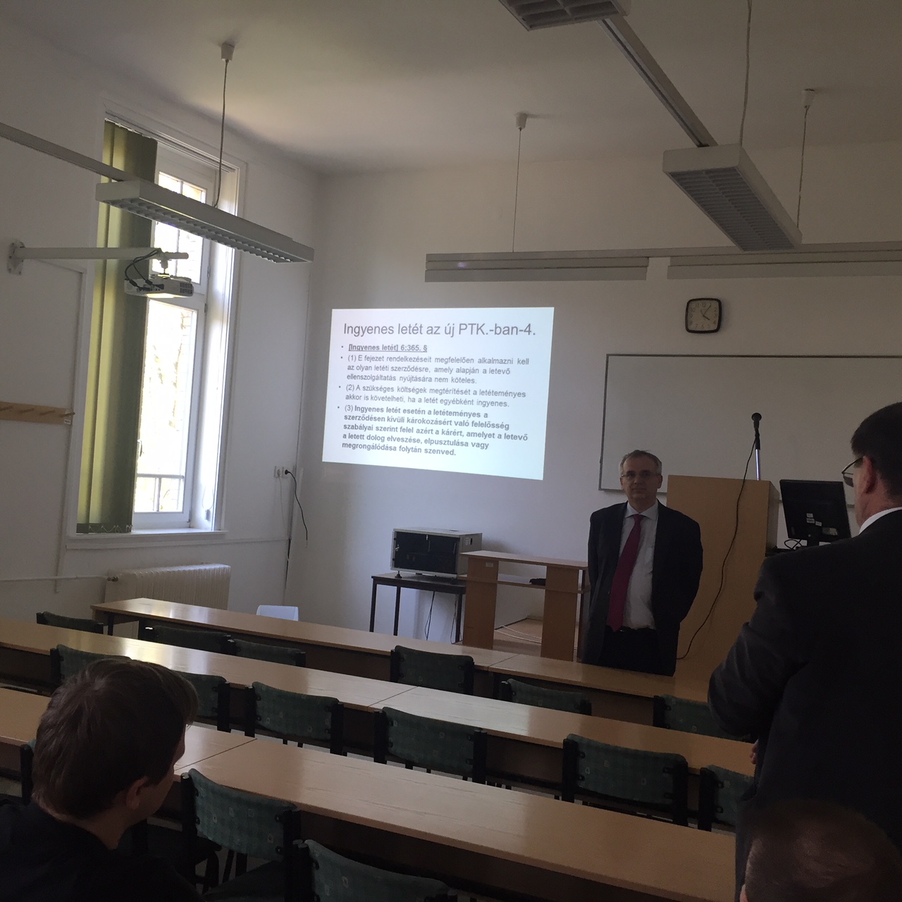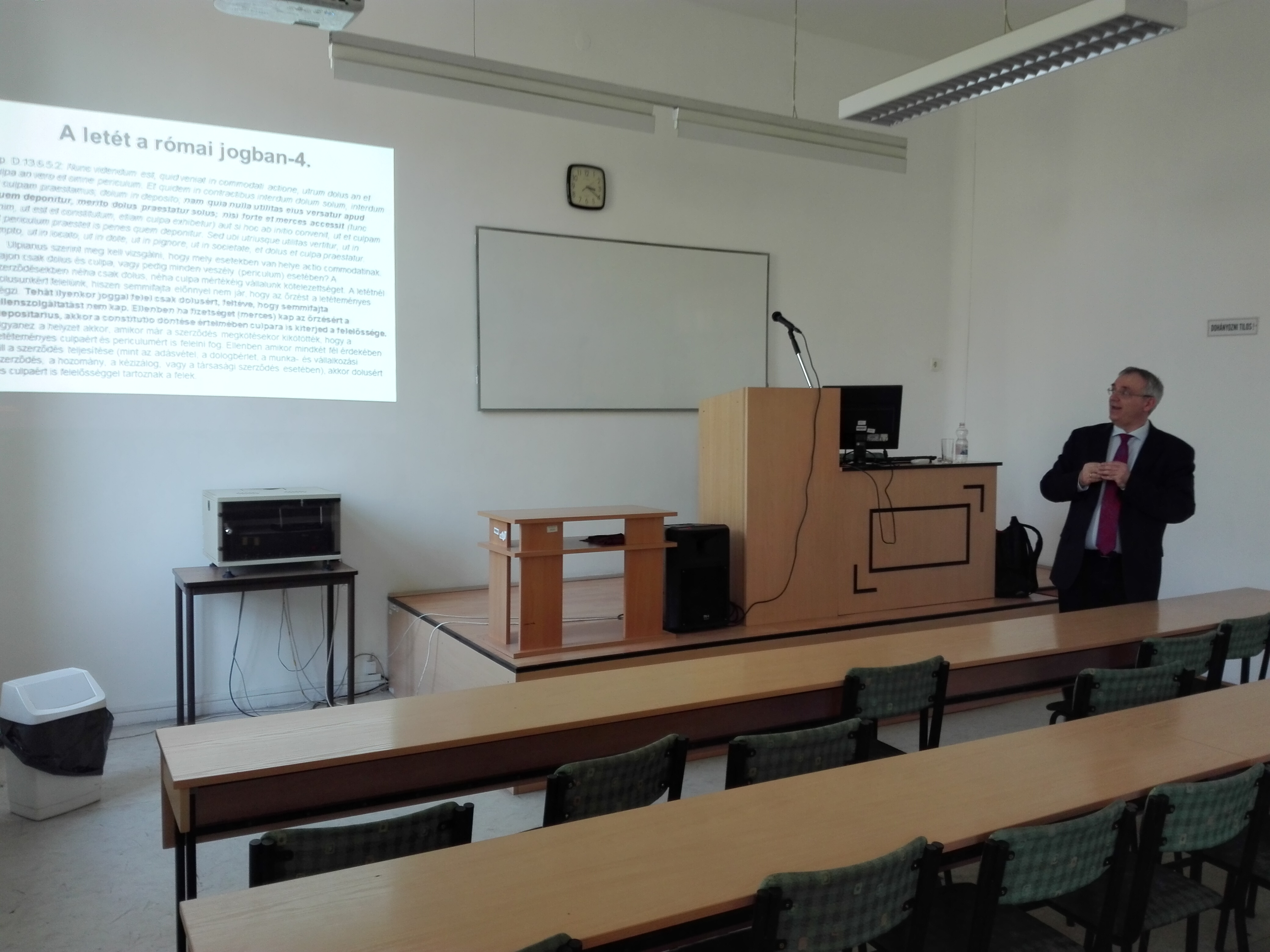 Az előadáson a hallgatók mellett részt vett Prof. Dr. Szalma József, Dr. Ocskó Eszter, valamint Dr. Boóc Ádám Tanszékvezető Úr is. Egy rövid köszöntő után az előadó hamar belelendült első hallásra is érdekesnek tűnő témájába. Az előadás első fele annak a tézisnek a kibontása volt, mely szerint a római jogban is létezett a visszterhes letét jogintézménye. E feltevés bizonyítása céljából az előadó bemutatta a témával kapcsolatos legjelentősebb római jogi forrásokat. A gondolatszál végén a hallgatók részére egy fontos tanácsot is megfogalmazott, mely szerint, ha egy kérdésben ütközik megítélésük a kollégáik véleményével, akkor a megoldást a forrásokban keressék.