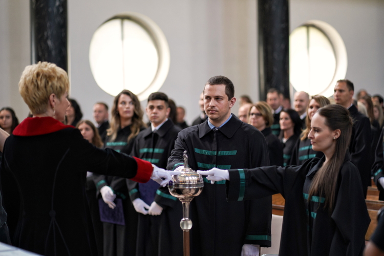 Dr. habil. Czine Ágnes rektori feladatokkal megbízott rektorhelyettes asszony ünnepi beszédében kiemelte, hogy a végzett hallgatók felelősségteljes és nemes hivatást választottak, mellyel mások sorsát fogják befolyásolni, ezért lelkiismeretes és fontos munka vár majd rájuk. Rektorhelyettes Asszony az itt töltött évek erőfeszítéseiről is beszélt, a befektetett munkáról, ami végül azt az örömöt hozta el, melyet az oklevelek átvételével érezhettek végzett hallgatóink. Kiemelte a család, a barátok támogatását, illetve a hit erejét, mely a tanulmányaik során adódott nehéz helyzetekben is megtartó erőként szolgált. A rómaiakhoz írott levél 8. fejezetének 31. versét idézve: „Ha Isten velünk, ki lehet ellenünk?” alapján hozzátette, hogy a megszerzett biztos tudás mellett a hit mindig elkíséri majd végzett hallgatóinkat az úton. Rektorhelyettes Asszony kiemelte, hogy ahogyan „az egyik ismert lelkész mondta: hittel tedd meg az első lépést. Nem kell hozzá látnod az egész lépcsőt, csak az első lépcsőfokot”.